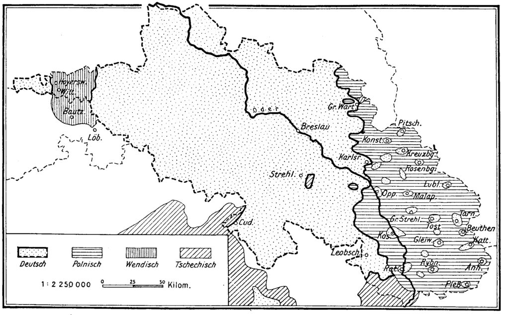 Aus billigen propagandistischen Gründen wird bis heute die Sprachenverteilung herangezogen, um den polnischen Anspruch auf „Slask”, also ganz Schlesien, zu begründen. Der von der unmittelbar betroffenen oberschlesischen Bevölkerung angemeldete Widerspruch wurde während der Plebiszitzeit durch politisch organisierten Terror (siehe https://silesiaweb.net/mord-an-theofil-kupka/) und nach 1922 durch weitere harte staatliche Maßnahmen verhindert. Um dies zu belegen, muss die politische Lage in Oberschlesien zur Zeit der Volksabstimmung und in den 1930er Jahren genauer beleuchtet werden. (Vergleiche mit https://silesiaweb.net/das-schicksal-der-deutschen-volksgruppe-in-ostoberschlesien-in-den-jahren-1922-1939/, https://silesiaweb.net/nationale-probleme-in-oberschlesien-im-19-und-zu-beginn-des-20-jahrhunderts/, https://silesiaweb.net/die-polnische-nationalitaetenpolitik-in-der-zwischenkriegszeit/)